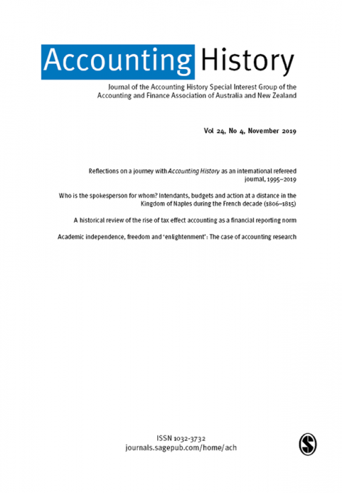 Accounting History is a specialist, international peer-reviewed journal that encourages critical and interpretative historical research on the nature, roles, uses and impacts of accounting and provides a forum for the publication of high quality manuscripts on the historical development of accounting across all organisational forms. The journal is acknowledged as a premier journal in its field and is a prized resource for academics, practitioners and students who seek to augment understanding of accounting's past and use that understanding to elucidate accounting's present and its possible future development. Accounting History is the official journal of the Accounting History Special Interest Group of the Accounting and Finance Association of Australia and New Zealand.