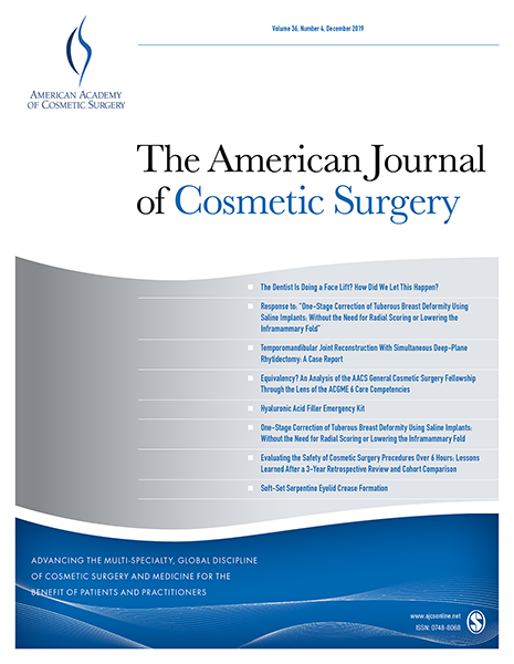 The American Journal of Cosmetic Surgery (AJCS) is the official publication of the American Academy of Cosmetic Surgery and is published quarterly in both print and online formats. The Journal features state-of-the-art cosmetic surgery procedures, topics and breakthroughs, all are written by distinguished experts in their respective fields. The Journal maintains a tradition of excellence in publishing original manuscripts relating to each area within cosmetic surgery, including Otolaryngology, Plastic and Reconstructive Surgery, Dermatology, Obstetrics/Gynecology, General Surgery, Ophthalmology and Oral and Maxillofacial Surgery. Peer-reviewed manuscripts reflect the highest quality and leading edge of knowledge.This journal is a member of the .