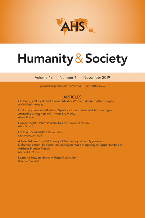 Humanity & Society, the official journal of the Association for Humanist Sociology, was first published in 1977 and has been published quarterly since 1978. Humanity & Society is a peer-reviewed Sage journal with abstracts of published articles appearing in Sociological Abstracts. It features “humanist sociology,” which is broadly defined as a sociology that views people not only as products of social forces but also as agents in their lives and the world. We are committed to a sociology that contributes to a more humane, equal, and just society.Please direct your inquiries and ideas to: Daina Cheyenne Harvey, Editor-In-Chief, at &Emma Lesser, Managing Editor, at .