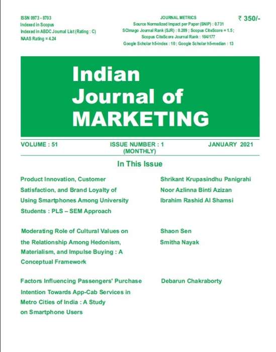 Indian Journal of Marketing is a double blind peer reviewed refereed monthly journal, which is being published since 1968. It is an authentic research publication dealing with the following topics: marketing, advertising, consumer behaviour, sales management, advertising & promotion management, marketing strategy, customer loyalty, marketing segmentation and targeting, customer value modelling, business information systems (MIS), business law, communication, direct marketing, e-commerce, global business, marketing research, marketing theory & applications, office administration/management, retailing, sales/selling, services, online branding, strategic use of IT, multichannel marketing, digital marketing, social media and social networks, viral marketing, mobile marketing, direct and interactive B2B marketing, and agricultural marketing among others.