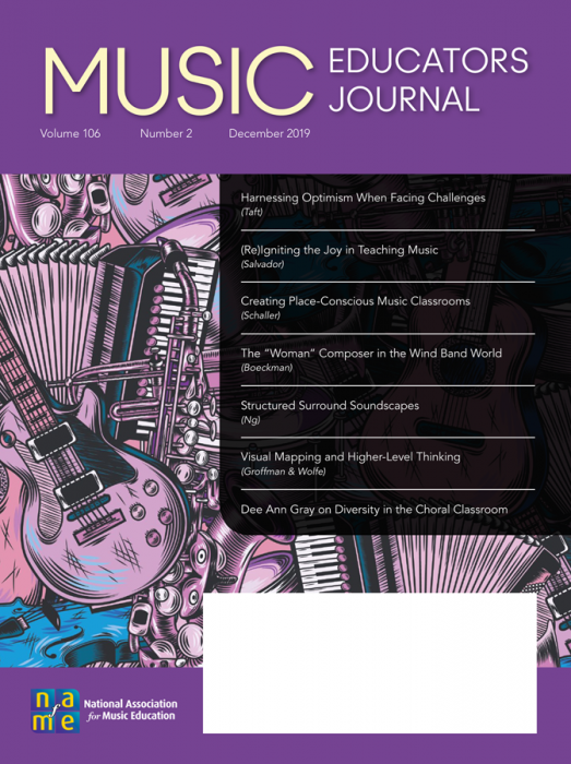 Music Educators Journal (MEJ) offers peer-reviewed scholarly and practical articles on music teaching approaches and philosophies, instructional techniques, current trends and issues in music education in schools and communities and the latest in products and services. Most issues include Readers Comment (letters from readers); NAfME Today (news for music educators); Samplings (summaries of recently published articles from other NAfME journals, including Journal of Research in Music Education, Journal of Music Teacher Education, General Music Today, and Update: Applications of Research in Music Education); and book, video, and technology reviews. Occasional Idea Bank columns present tips from practitioners at all levelsOther NAfME journals can be found at General Music Today ()Journal of Music Teacher Education ()Journal of Research in Music Education ()Update: Applications of Research in Music Education ()